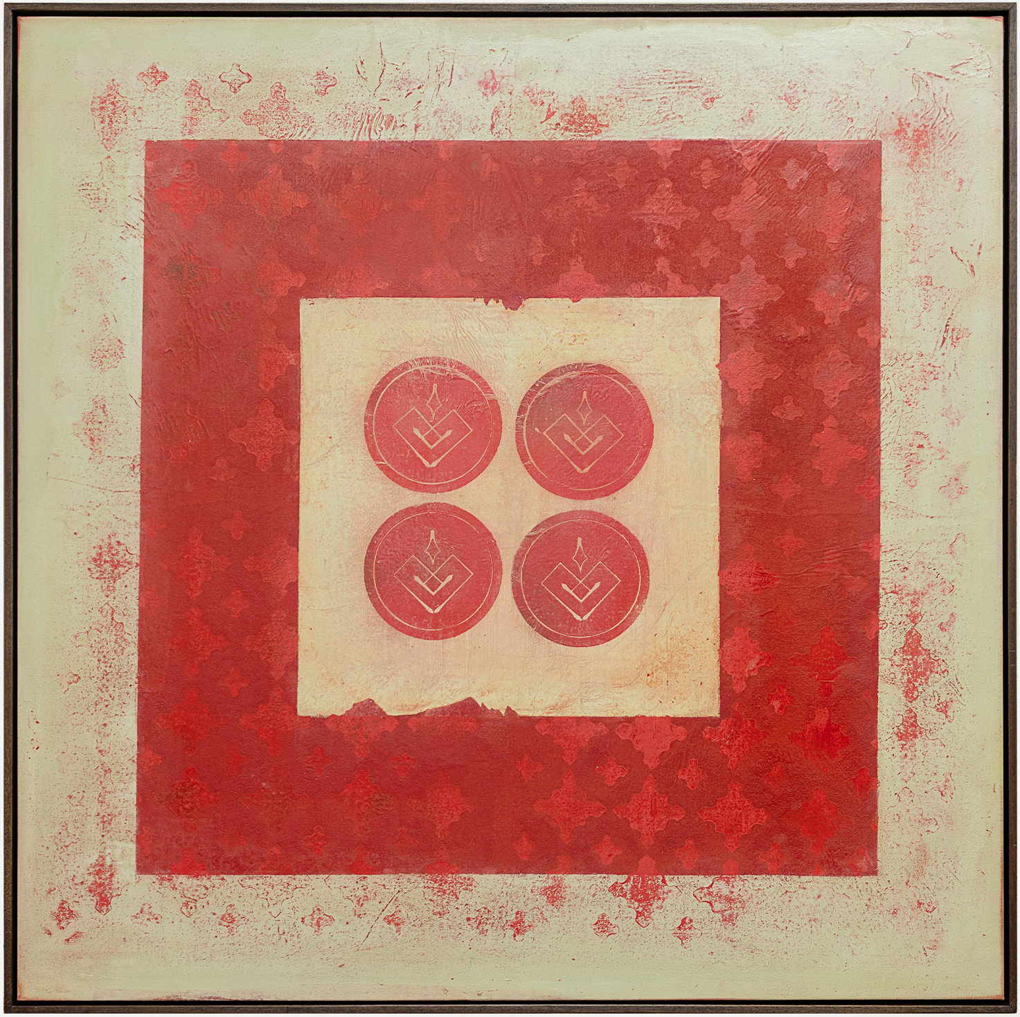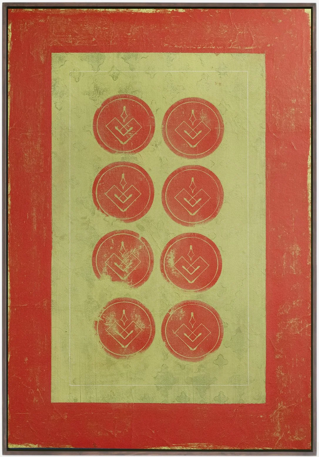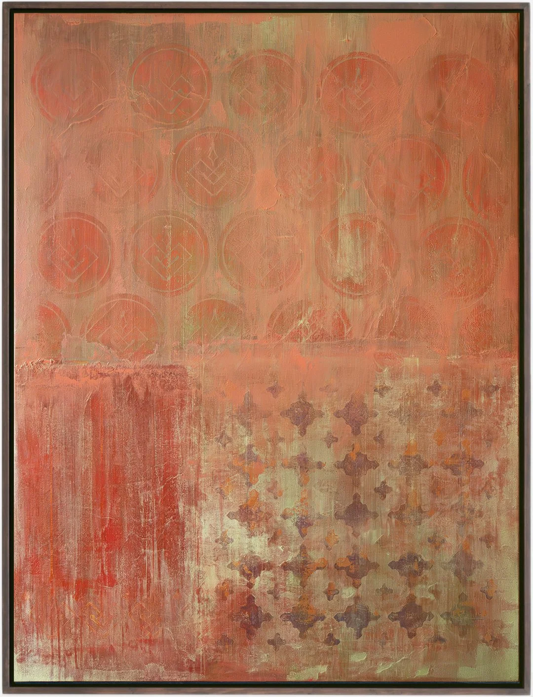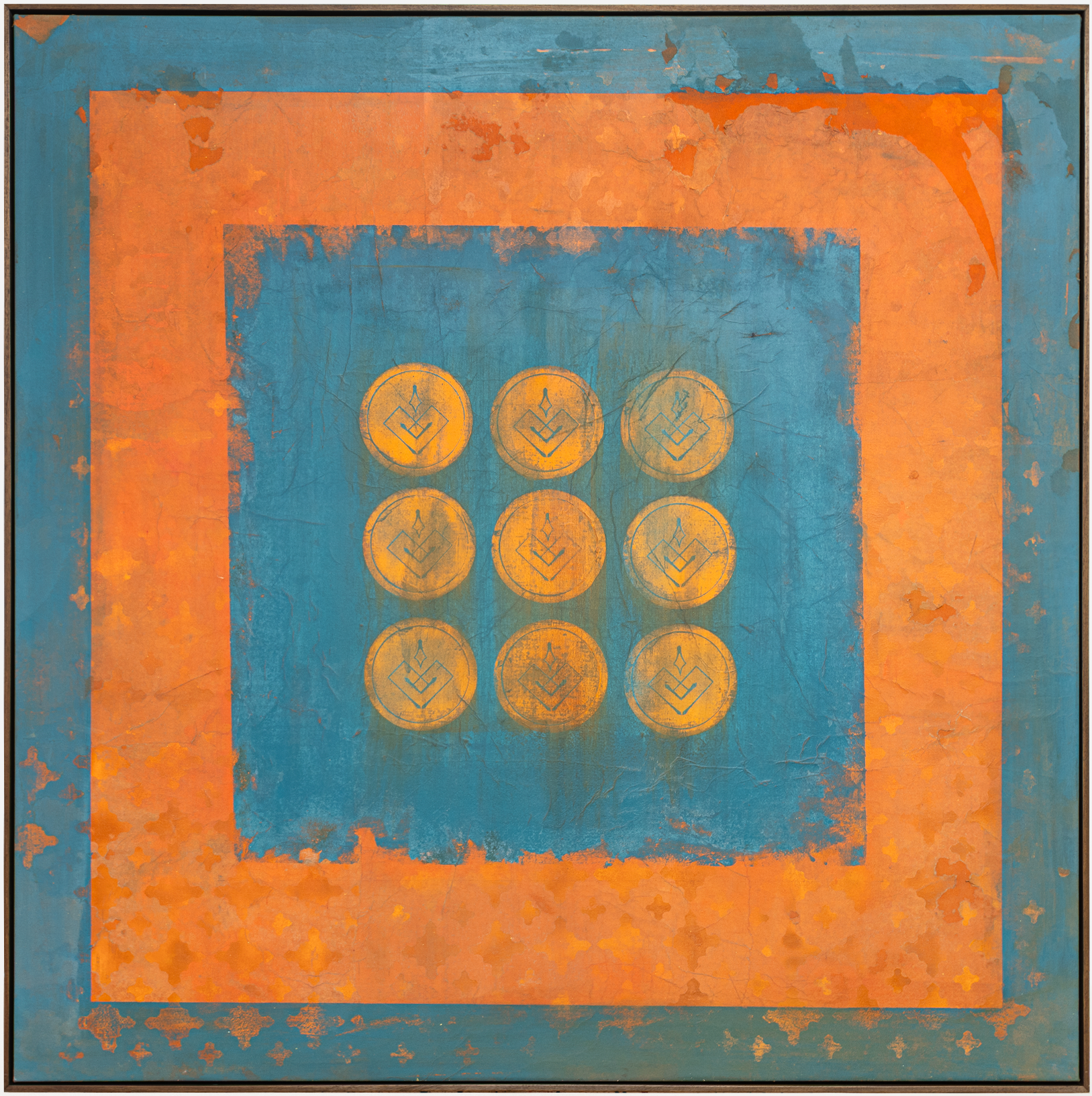 This work captures those moments where beauty lies in impermanence, surfacing in those spikes of aliveness, like a heightened nervous system pulse, expressing the tension between reality and intention. The ever-changing flow, textures, stain washes, chaos and freedom represent reality itself, life in constant motion, full of unpredictability and often beyond our control. The symbology, on the other hand, represents intention: solid, structured points we choose to give meaning within that flow.