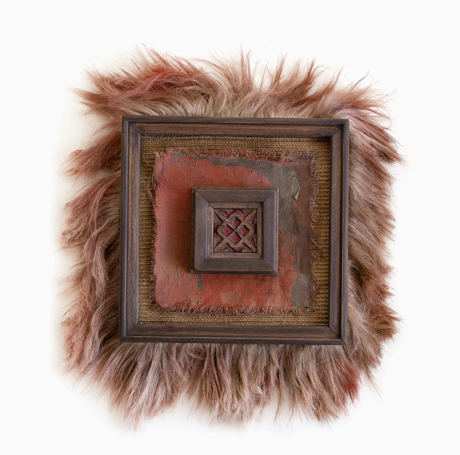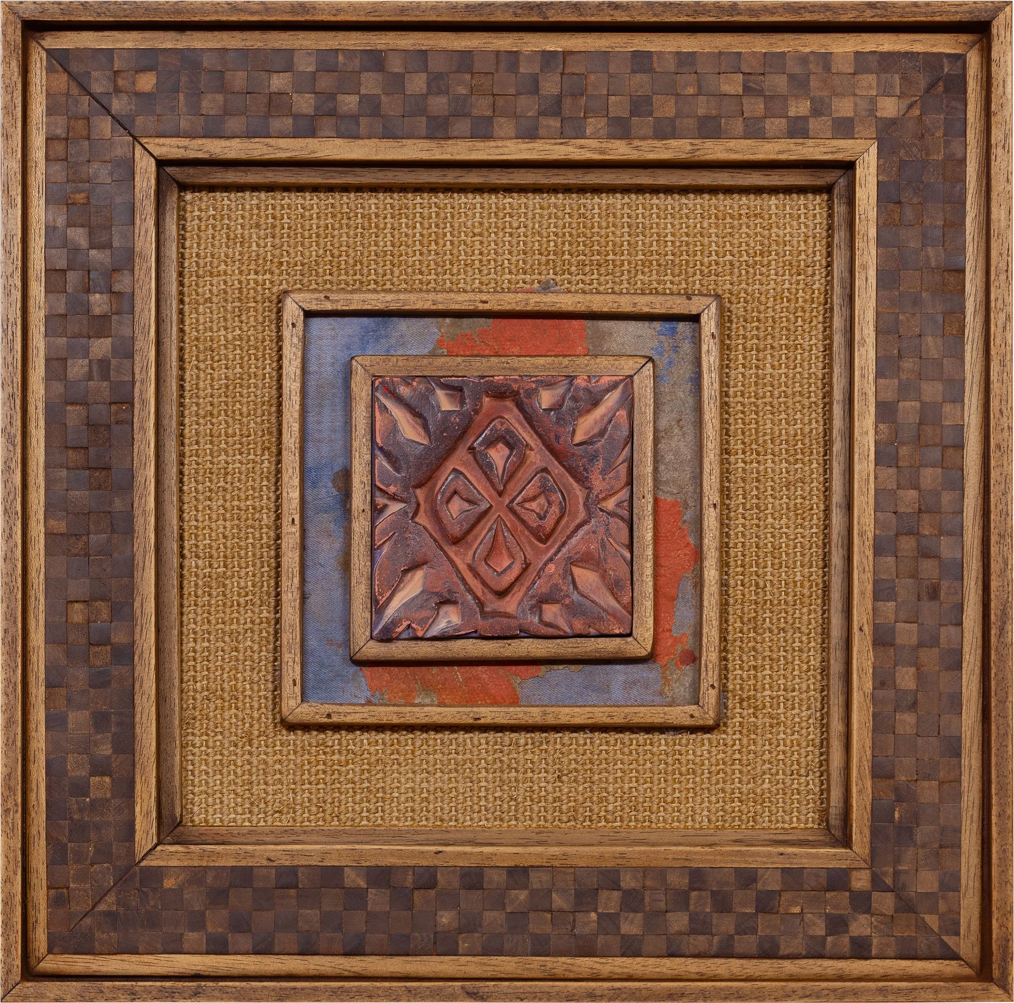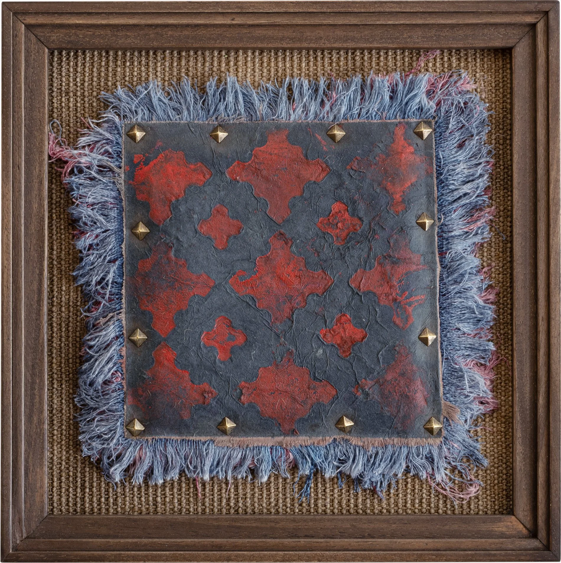 Oil on printed cotton paper, brass nails on cotton and jute, woven in Brazil and Mexico